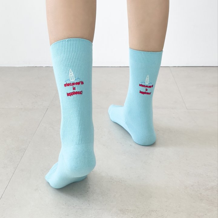 Made in South Korea and crafted from soft ribbed cotton, these cozy crew socks feature embroidered lettering on the back that reads: “What on earth is happiness?” – paired with whimsical icons like a rainbow or rocket.
