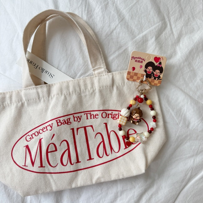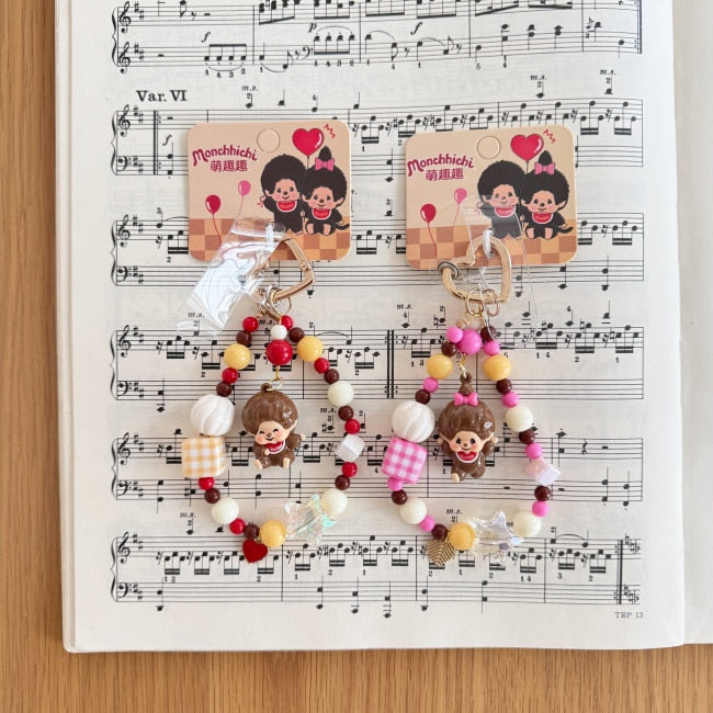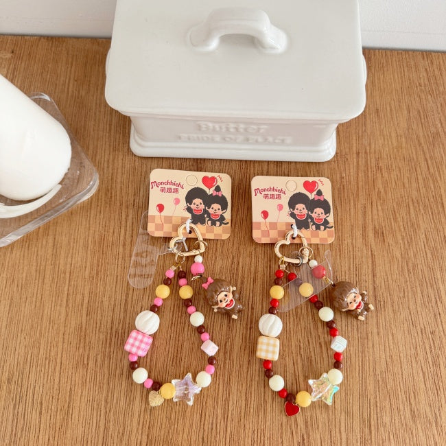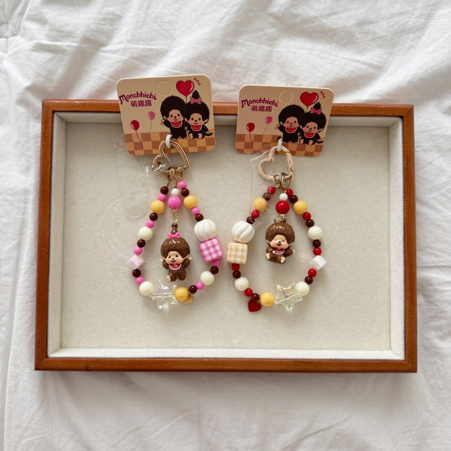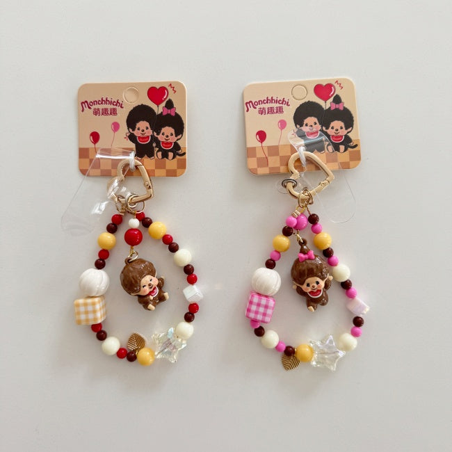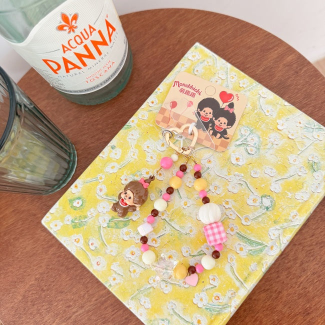 This beaded keychain features a cute moncchichi charm paired with colorful assorted beads and a heart-shaped carabiner.
