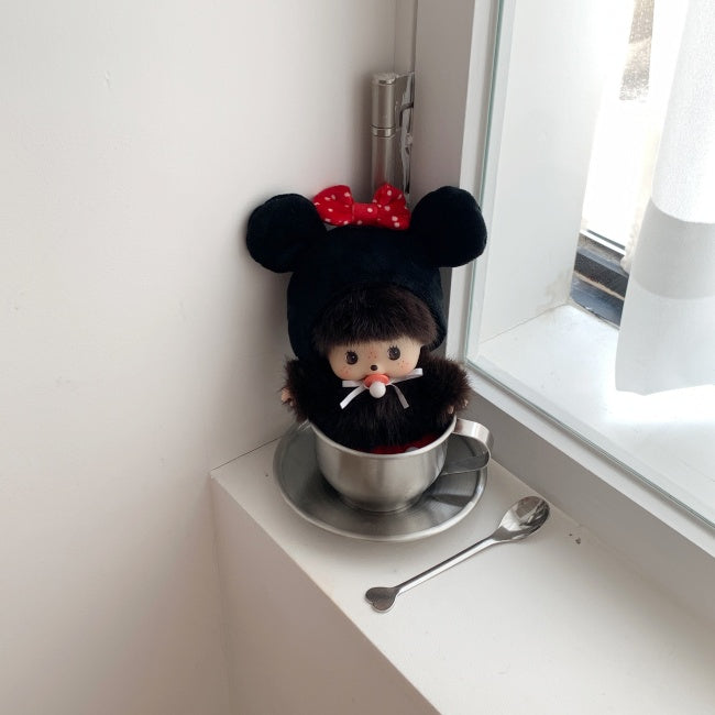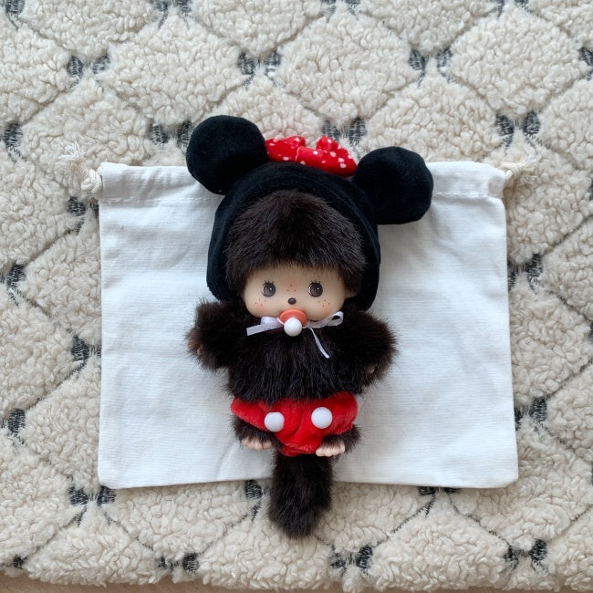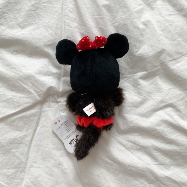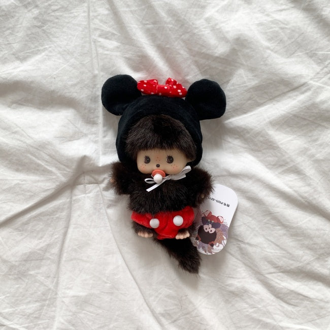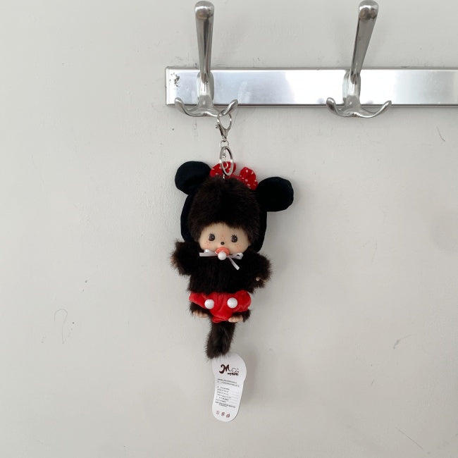 This best-selling baby monkey furry doll keychain is dressed in an iconic cartoon mouse-inspired outfitâcomplete with round mouse ears, a red polka dot bow, and matching shorts. Its soft, plush texture and classic dollcore look make it a standout charm for bags, backpacks, keys, or display.