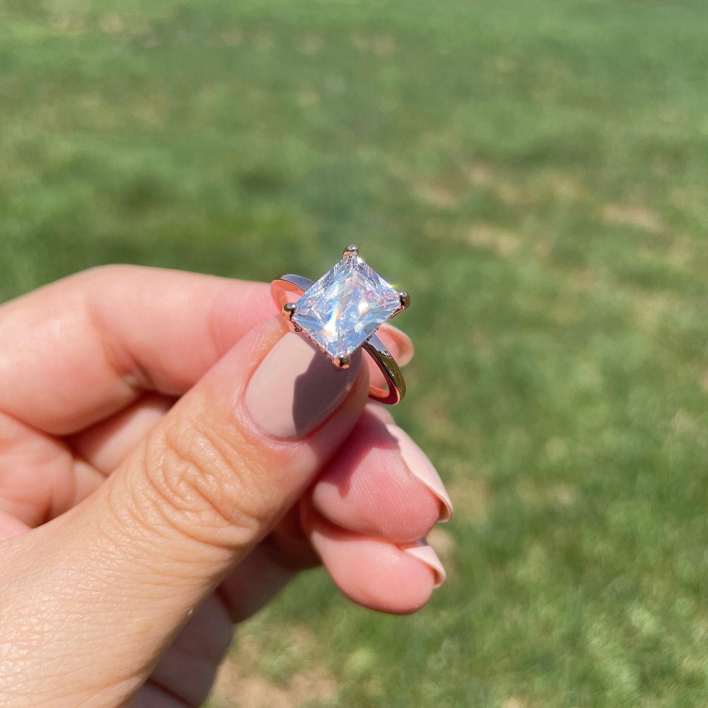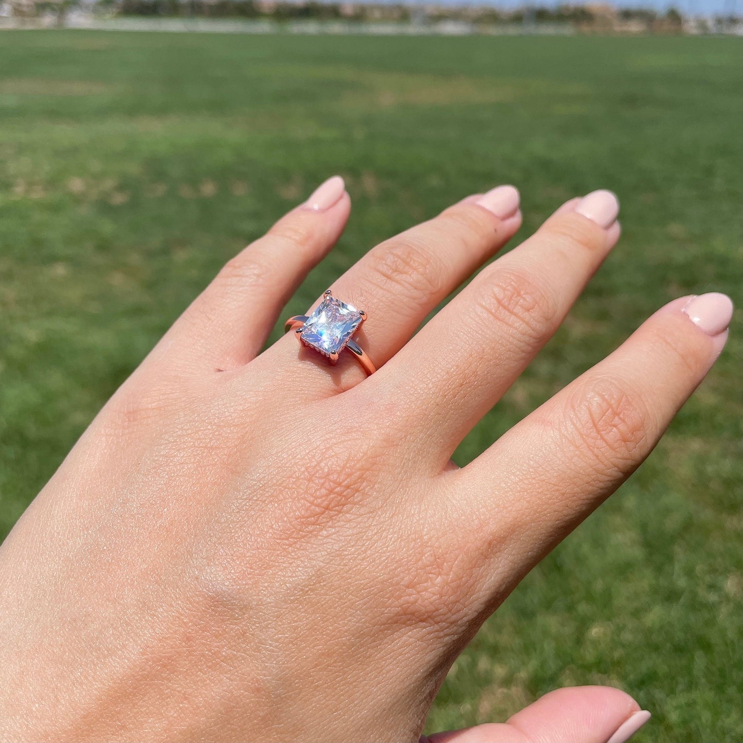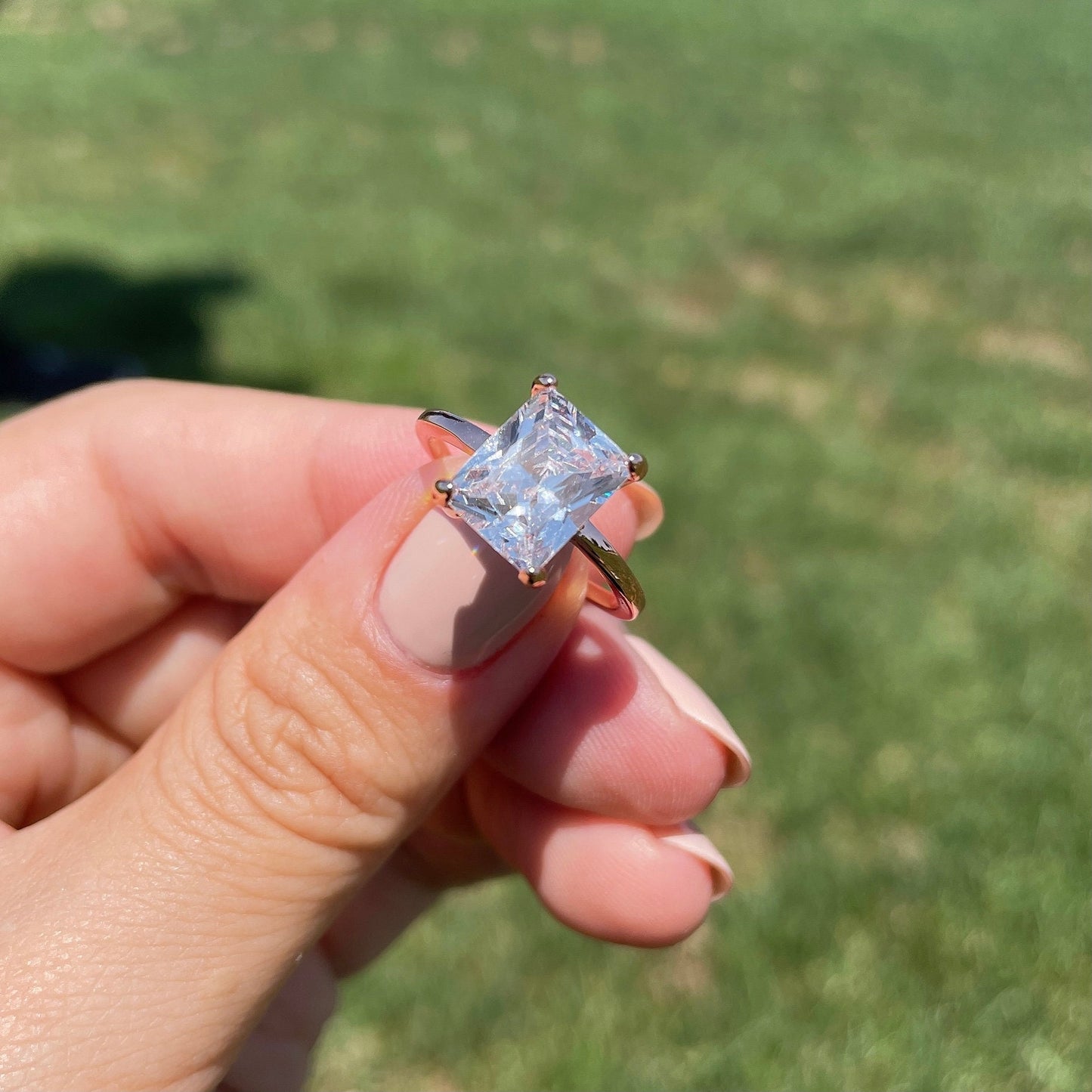 Rose Gold Emerald Cut Diamond Pave Basket Wedding Ring, Crystal Engagement Solitaire Ring, Affordable Sustainable Korean Jewelry