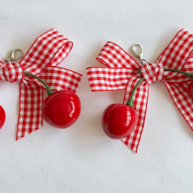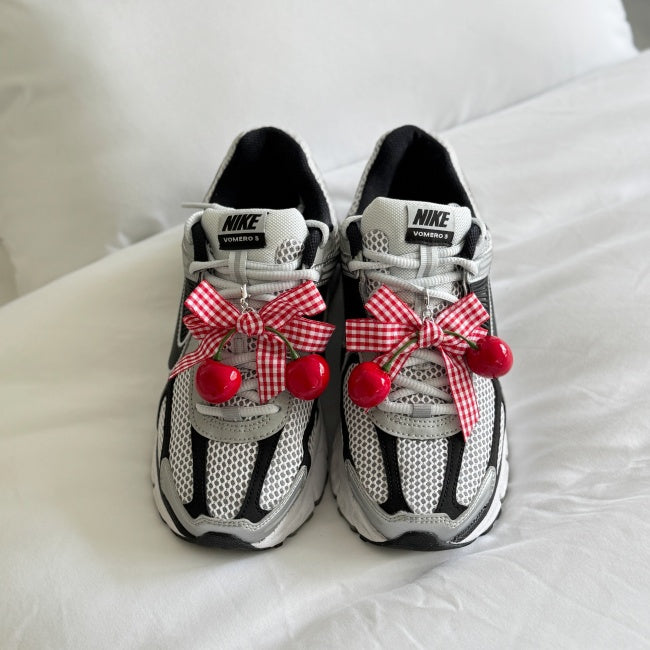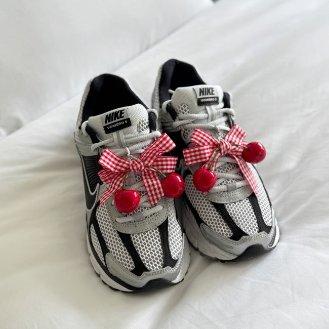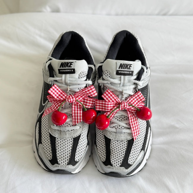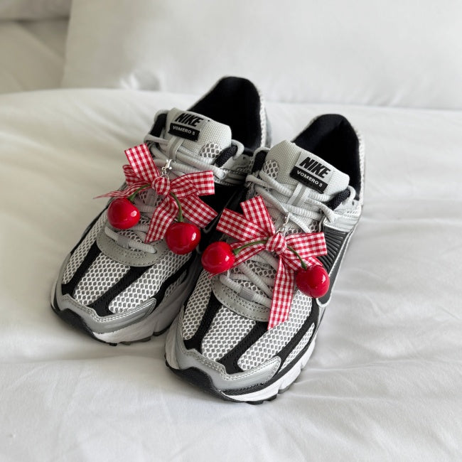The gingham ribbon creates a vintage-inspired feel, while the glossy cherry drops add a juicy pop of color and personality. Attached with a lobster claw for easy use, it clips securely onto your shoelaces, giving your shoes a fresh, fashionable upgrade.
